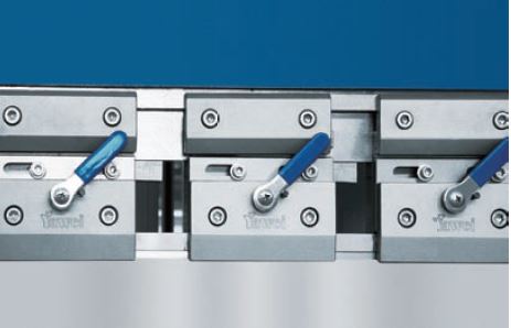 - Automatyczna hydrauliczna przeciwwaga w postaci płaskich cylindrów hydraulicznych w każdej prasie krawędziowej typu PBH zamontowana w trzyczęściowy stół pracy dla zapewnienia absolutnej dokładności kątów na całej długości cięcia.